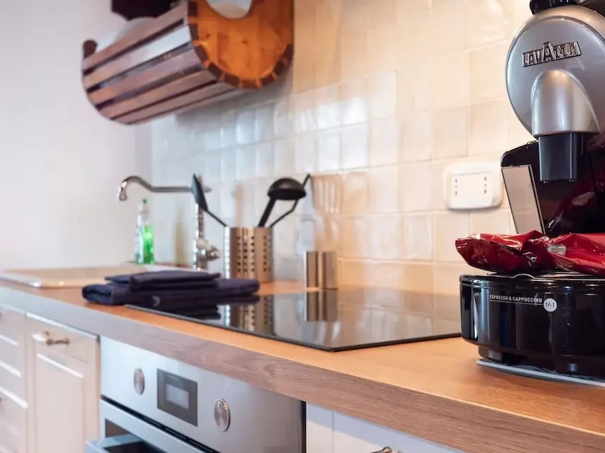 La cucina è attrezzata con frigorifero/congelatore, lavastoviglie, piano cottura a induzione, forno, bollitore e macchina caffè e con ogni stoviglia necessaria per cucinare e consumare pasti all’interno o all’esterno.
