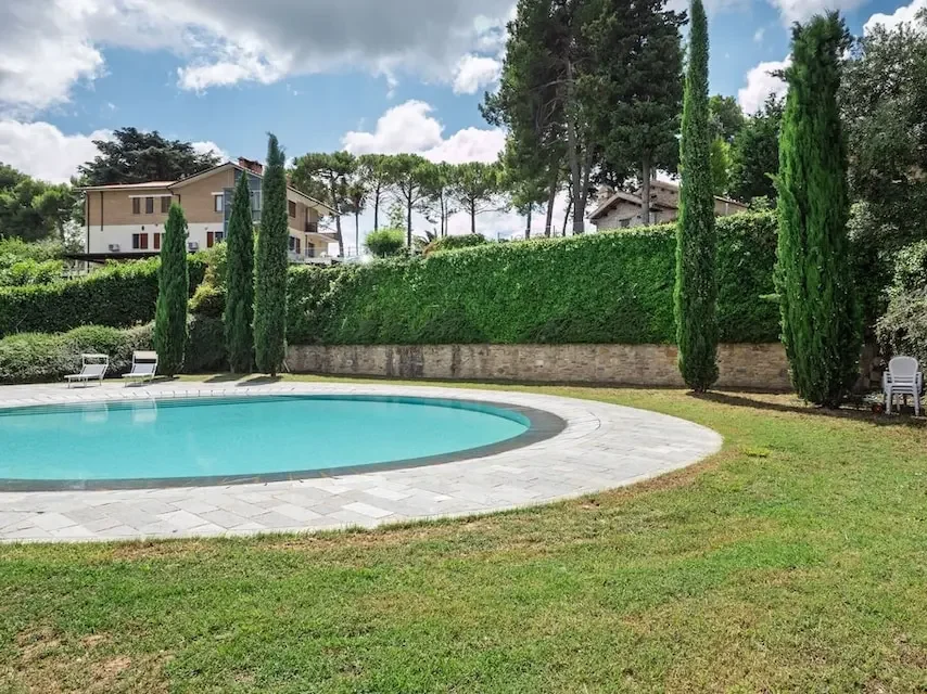 Gli ospiti possono rilassarsi nel giardino comune attrezzato di tavoli, sedie, cuscini ed ombrellone o fare un tuffo rinfrescante nella grande piscina comune di oltre 150 mq, situata in un’area della proprietà isolata in mezzo al verde e con un panorama mozzafiato sulle colline verdeggianti e in fondo l’azzurro del mare Adriatico.
